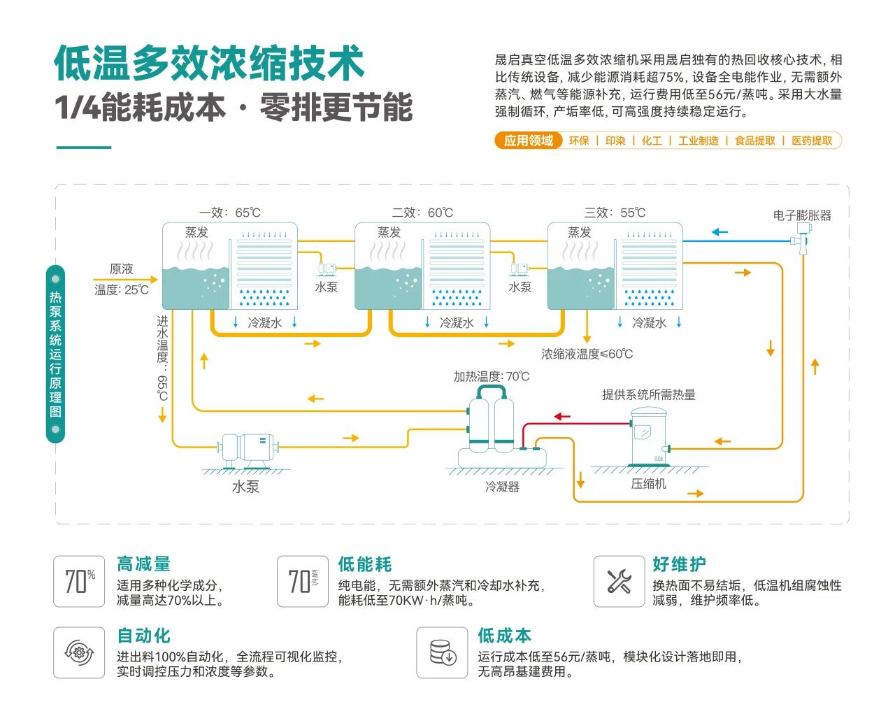 低温蒸发:在40-70℃低温下运行,精准控温,稳定高效;